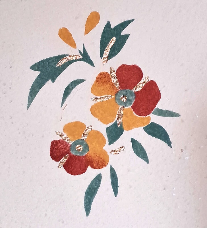 Rekonstruktion einer bauzeitlichen, künstlerischen Wandfassung durch Herstellen von Schablonen und Nachmischen der vorgefundenen Farbtöne